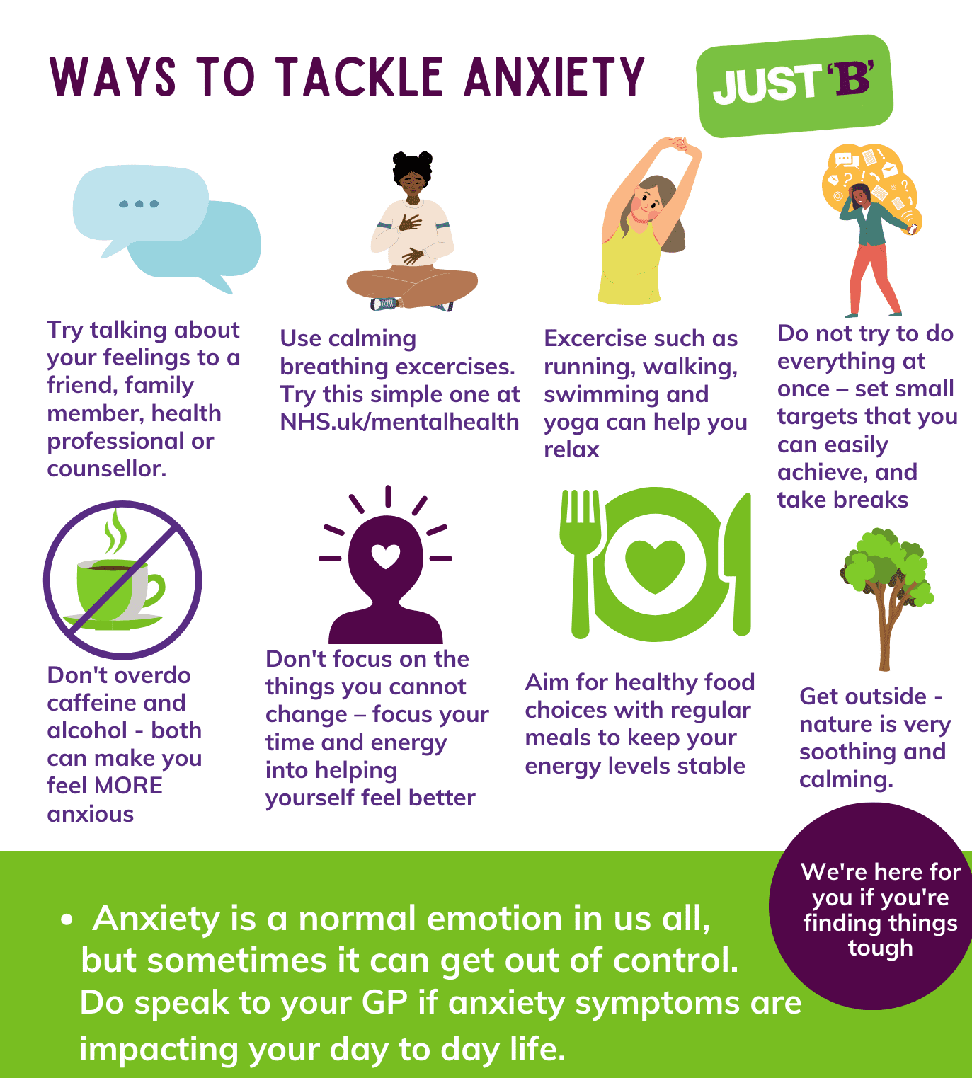 Remember, we’re here via for you via Just ‘B’ Hear to Help. If you’re feeling anxious, isolated, bereaved or struggling with any aspect of your mental health or emotional wellbeing, find out more.
